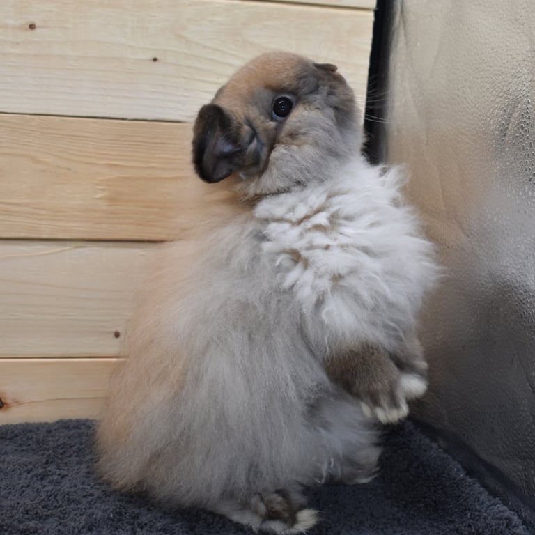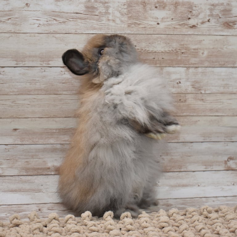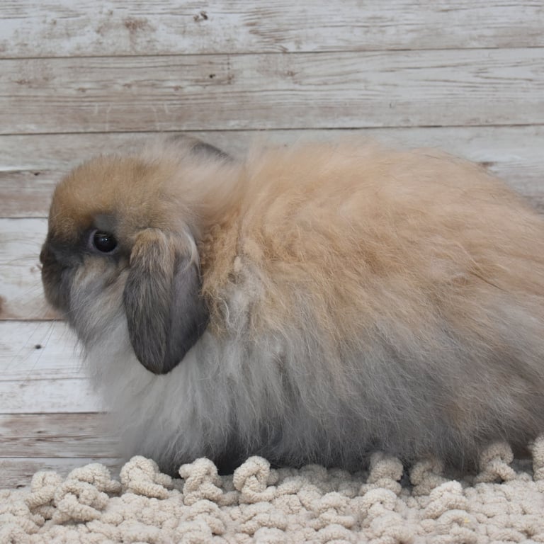 Because Driftwood is a fuzzy Holland Lop, he will need to be placed with a person/family with plenty of time for his extra grooming needs. If not brushed regularly, mats tend to develop pretty much everywhere. The baby coat usually needs to be clipped off, as it has a different, more cottony texture that mats more easily. If daily brushing can be part of his routine, the longer, more luxurious coat may be manageable. The few fuzzy Hollands born and placed through Hot Cross Buns have gone to families who prefer to clip their coats into something resembling a puppy cut, which looks adorable on them. There are professional groomers out there who have bunny clients, but it's best to find one or know that you can learn to clip them yourself before committing to a fuzzy. Clipping will need to be done every 2-3 months, depending upon how much brushing time you can spend with them every day/week. Fuzzy Hollands always appreciate a shorter coat in the summer months, regardless.