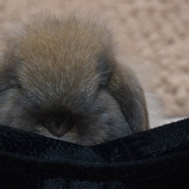 Driftwood is a very handsome black tort fuzzy Holland Lop. He's quite amusing, as half of the time he has a clueless, vacant expression on his face, and the other half of the time, he's hamming it up and being a complete goof. He is quite the smoosh Bun and loves cuddles. He's a bit more active than his sister, but that's not saying much because they are both little potatoes. Outside of being cuddled, his favorite activity seems to be washing his face and paws. He likes to try to climb up pillows and cushions and slide down them, but sometimes needs a little boost to get his furry tushie where he wants to go. Nothing really fazes Driftwood and his demeanor never seems to change. He's a very solid, stable kind of guy. He likes to nap and cuddle in the lap of a trusted person. Driftwood is the spitting image of his sire Sullivan in terms of personality.