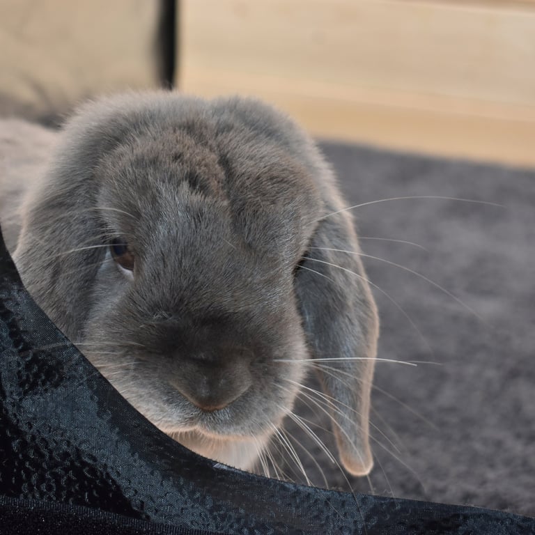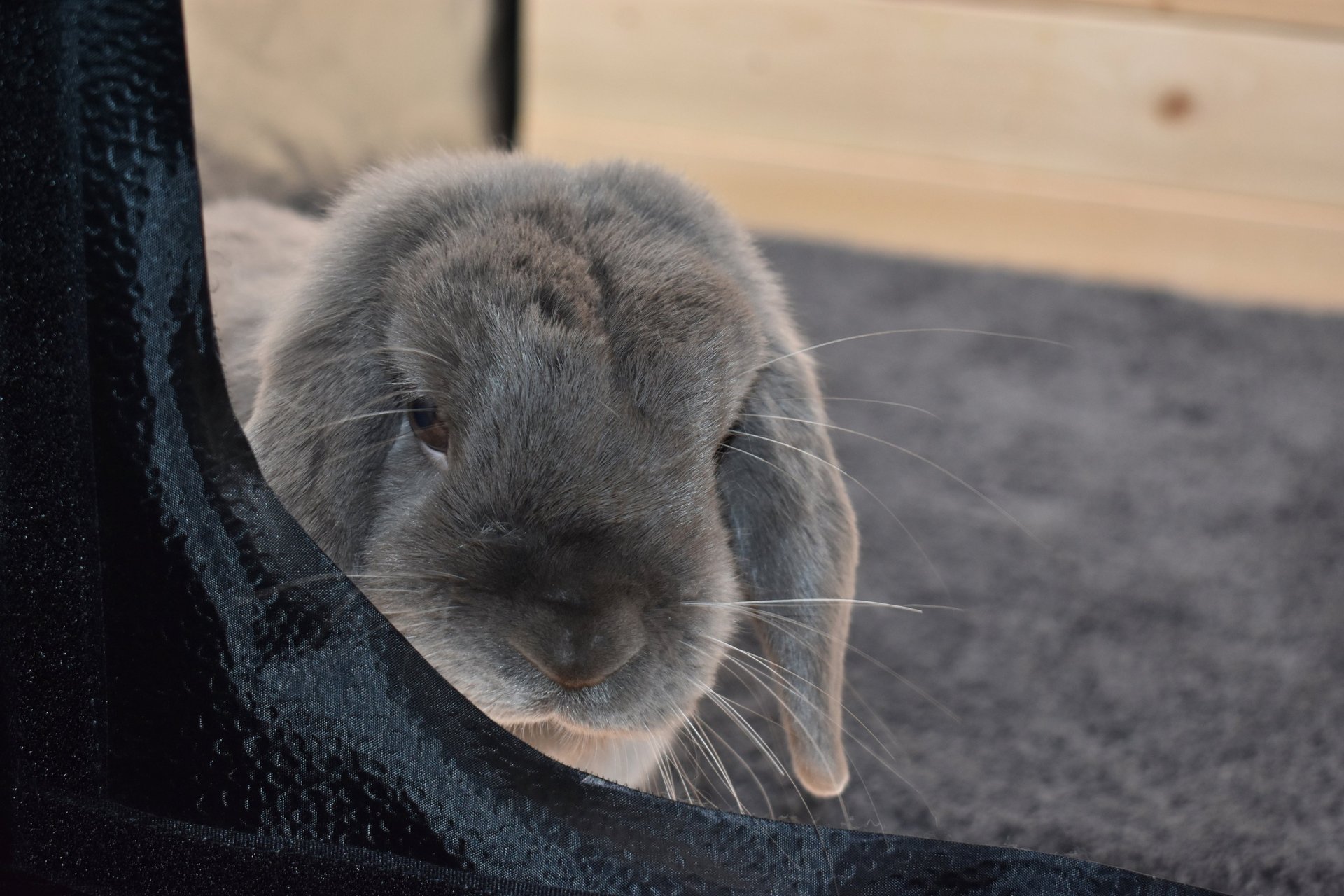 Gumption is a total Eeyore Bun. He keeps his head down and muddles through life the best he can. His expression rarely changes, and I every time I interact with him, I think I hear him say, "Thanks for noticing me," in his best Eeyore voice. That's not to say he doesn't have some spirit and sass to him. He does! His thumps are true thumps and even startle our nearly deaf elderly dog from across the room and down the hall. He does not like to have his picture taken and went so far as to nearly chomp through the wire for the lightbox light. Thank goodness for electrical tape! I have learned to sit across the room and use my longer range camera lens to try to get better photos that show off more of his personality. If I sit too close to him, he puts his head down and goes full Eeyore.
