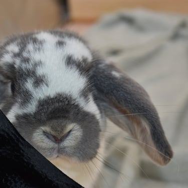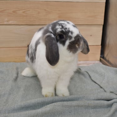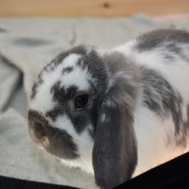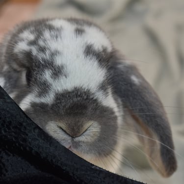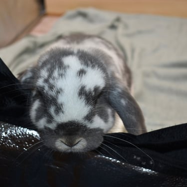 Kayak is an absolute smoosh of a Bun. She is comfortably sociable, but likes to observe when people aren't directly interacting with her. When she's feeling content and relaxed, she will express her happiness with a mighty flop onto her side. She is a gentle little doe with a loving temperament. She's almost always up for a good cuddle. Kayak will do some exploring, but never seems to wander very far before checking back in with her person or littermates.