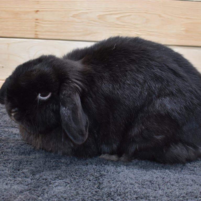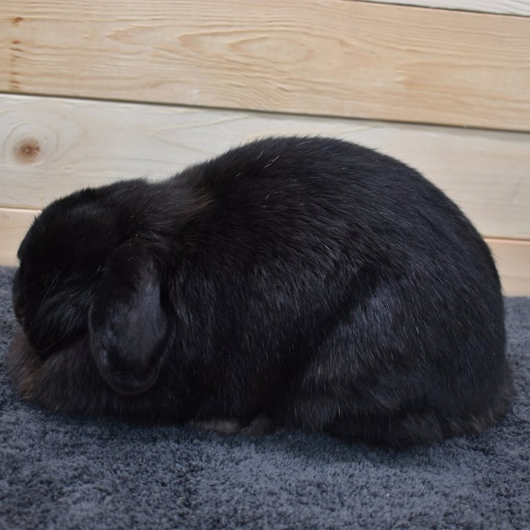 We believed she would be a fairly chunky false dwarf girl, but she surprised us by staying on the petite side and developing a lovely dewlap and some dainty pantaloons. We're waiting to place a few more of our waiting Buns before attempting to breed her for the first time.